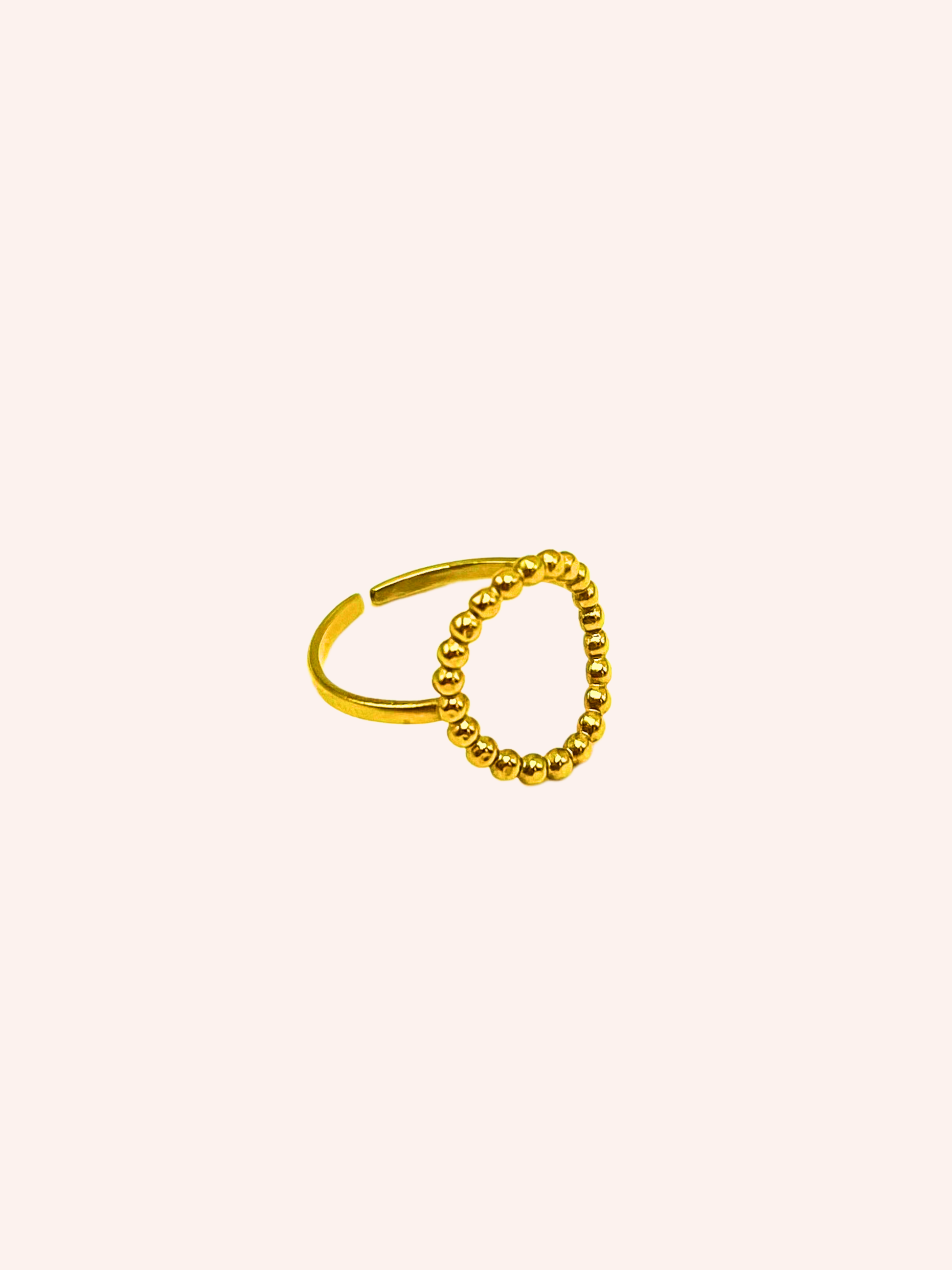 Anillo con forma de círculo decorado con diseño de bolitas. Es de acero inoxidable con baño de oro, ajustable. Es regulable y ajustable a tu medida.