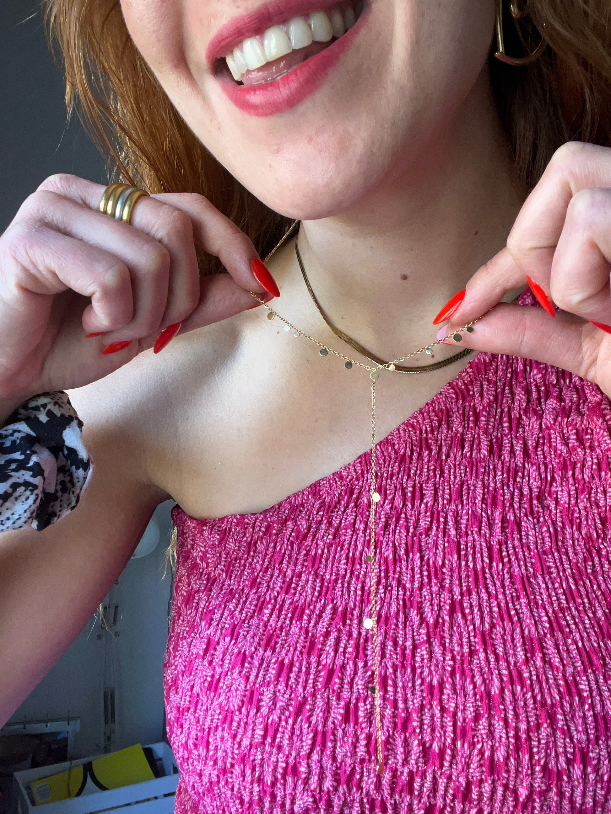 Cadena de acero inoxidable bañada en oro con una cadena que cuelga en medio, está lleno de medallas pequeñas. Perfecto para combinar con otros colgantes y verte guapa y elegante! Está muy de moda!