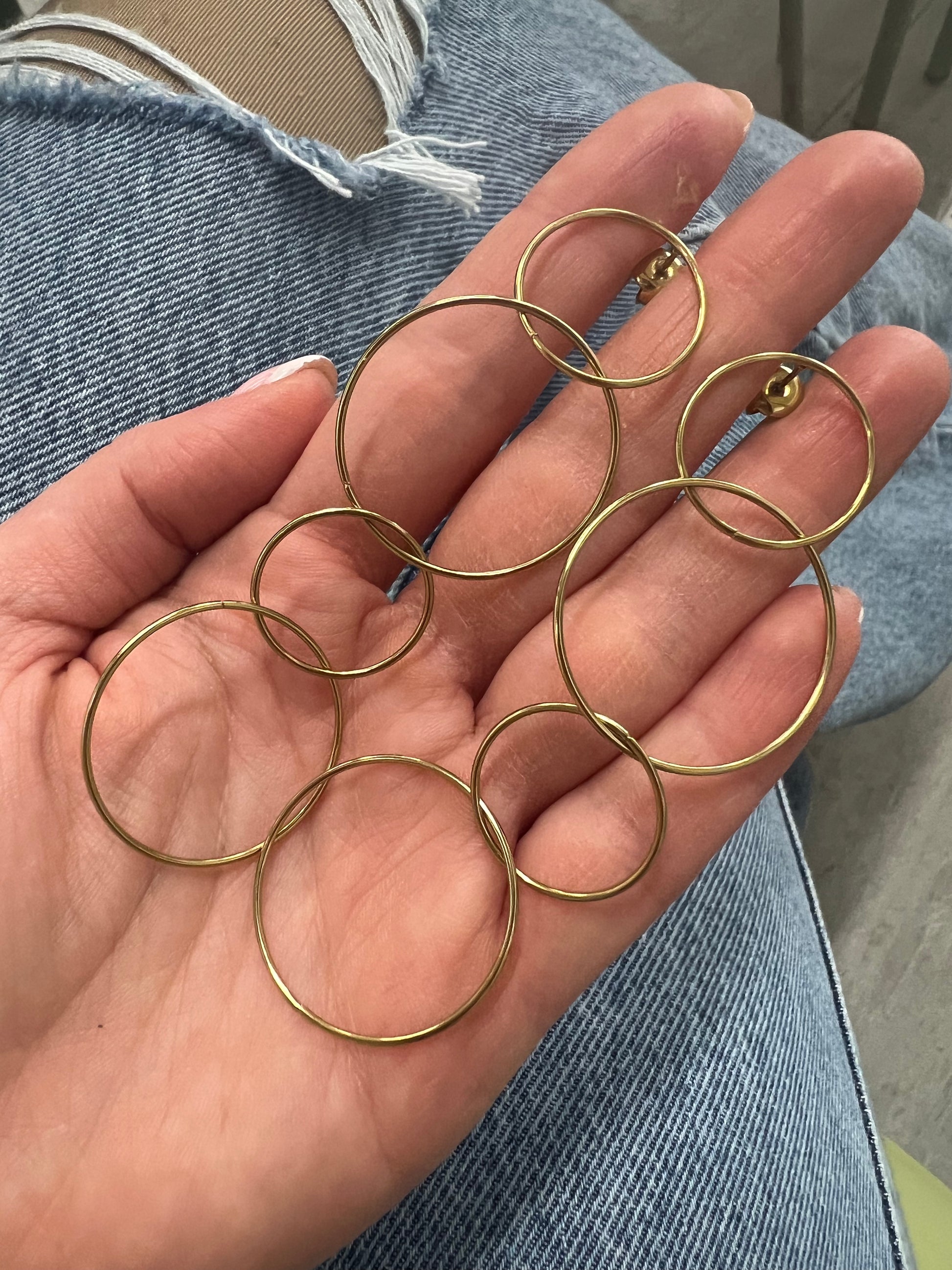 Pendientes de acero bañados en oro, formados de 4 aros enlazados entre ellos de dos tamaños distintos. Estos pendientes te van a encantar, con un punto elegante y femenino increíbles. Son muy combinables para todo el año, os fliparon en el último market! No te quedes sin ellos!